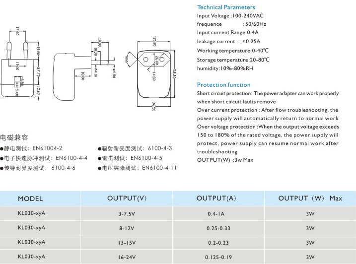 頻率:50/60Hz 輸入電流:0.4A 漏電電流:≤0.25A 工作溫度:0-40℃ 貯藏溫度:-20-80℃ 濕度:10%-80%RH 短路保護: 電源適配器在短路解除時能正常工作恢復(fù) 過流保護:過流故障排除后,電源將自動恢復(fù)正常工作 過壓保護:當輸出電壓超過額定電壓的150-180%時,電源將保護,故障排除后電源能恢復(fù)正常工作" />