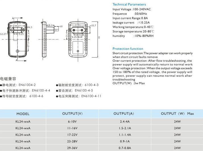 頻率:50/60Hz 輸入電流:0.8A 漏電電流:≤0.25A 工作溫度:0-40℃ 貯藏溫度:-20-80℃ 濕度:10%-80%RH 短路保護(hù): 電源適配器在短路解除時(shí)能正常工作恢復(fù) 過(guò)流保護(hù):過(guò)流故障排除后,電源將自動(dòng)恢復(fù)正常工作 過(guò)壓保護(hù):當(dāng)輸出電壓超過(guò)額定電壓的150-180%時(shí),電源將保護(hù),故障排除后電源能恢復(fù)正常工作" />